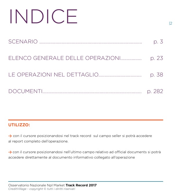E’ uno strumento di lavoro indispensabile per investor, originator, servicer, advisor e studi legali nato dall’esigenza di fornire al mercato italiano ed estero un quadro costantemente aggiornato sulle operazioni di compravendita di portafogli crediti e di M&A nel settore del credit management.